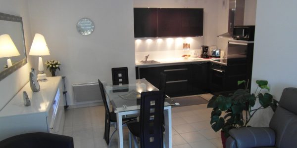 Un séjour (24m²) ouvrant sur un agréable balcon (5m²) offrant une vue sur le parking arboré, et d’une cuisine américaine équipée (hotte aspirante-réfrigérateur encastré-four-plaque à induction-poubelles sélectives),