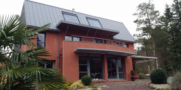 En forêt, sur coteau – 30’ Vannes – Lorient – Brique monomur – Toutes couvertures zinc quartz – Chauffage bois Tulikivi